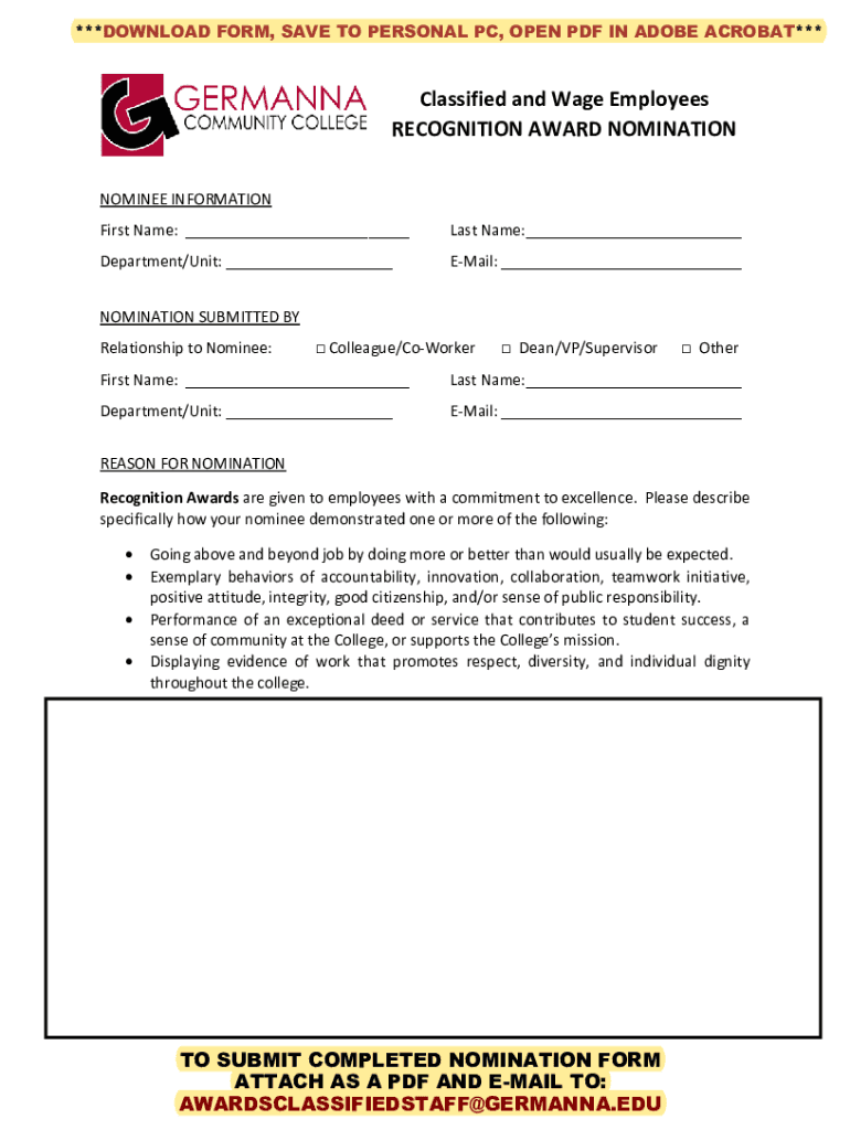 ***DOWNLOAD FORM, SAVE TO PERSONAL PC, OPEN PDF IN ADOBE ACROBAT***Classified and Wage Employees RECOGNITION AWARD NOMINATION NOMINEE INFORMATION First Name: ___Last Name:___Department/Unit: ___Email: