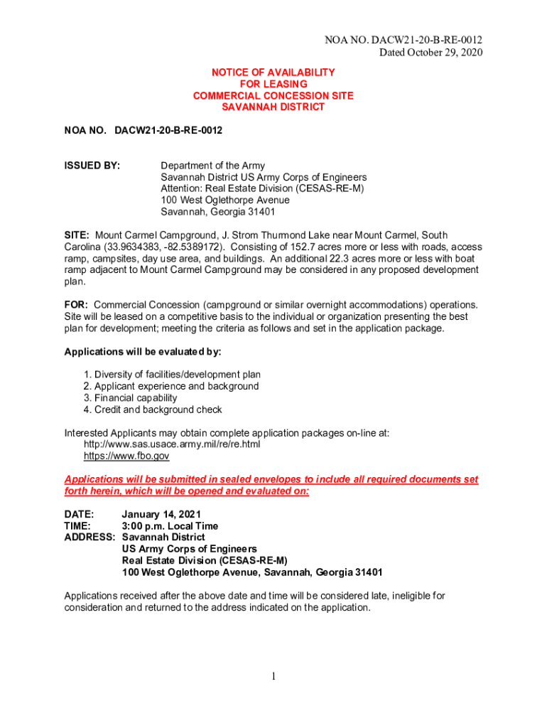 NOA NO. DACW2120BRE0012 Dated October 29, 2020, NOTICE OF AVAILABILITY FOR LEASING COMMERCIAL CONCESSION SITE SAVANNAH DISTRICT NOA NO. DACW2120BRE0012 ISSUED BY:Department of the Army Savannah District