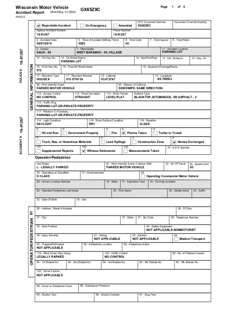 Wisconsin Motor Vehicle Accident ReportPageGX65Z9CMV4000e 01/20051of 5PK2012 DOT Document NumberReportable Accident EmergencyAmendedAgency Accident NumberPolice Number16012674 Accident Date5 Time