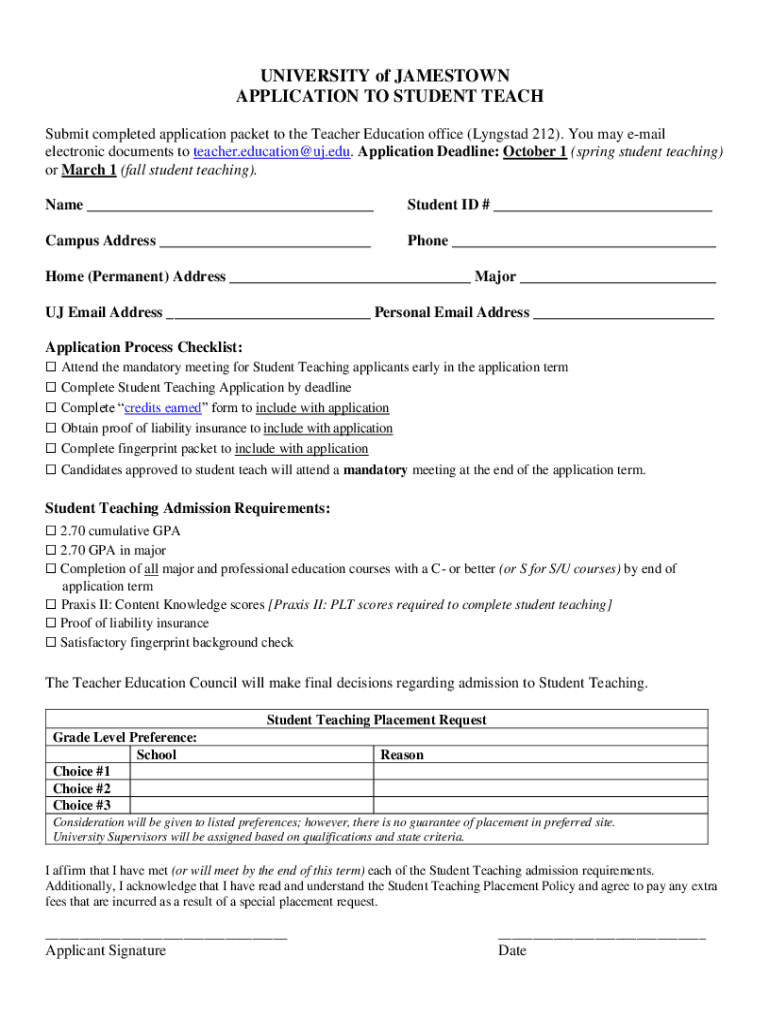 UNIVERSITY of JAMESTOWN APPLICATION TO STUDENT TEACH Submit completed application packet to the Teacher Education office (Gangsta 212). You may email electronic documents to teacher.education@uj.edu.