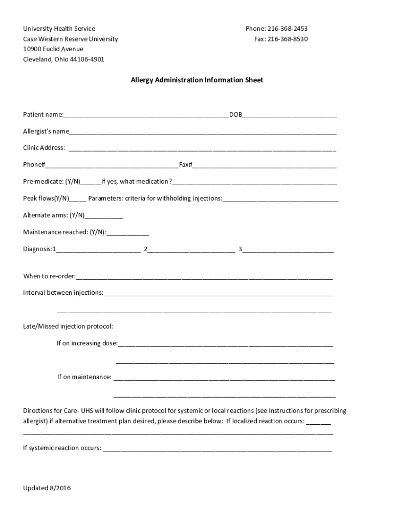 University Health Service Case Western Reserve University 10900 Euclid Avenue Cleveland, Ohio 441064901Phone: 2163682453 Fax: 2163688530Allergy Administration Information SheetPatient name:___DOB___