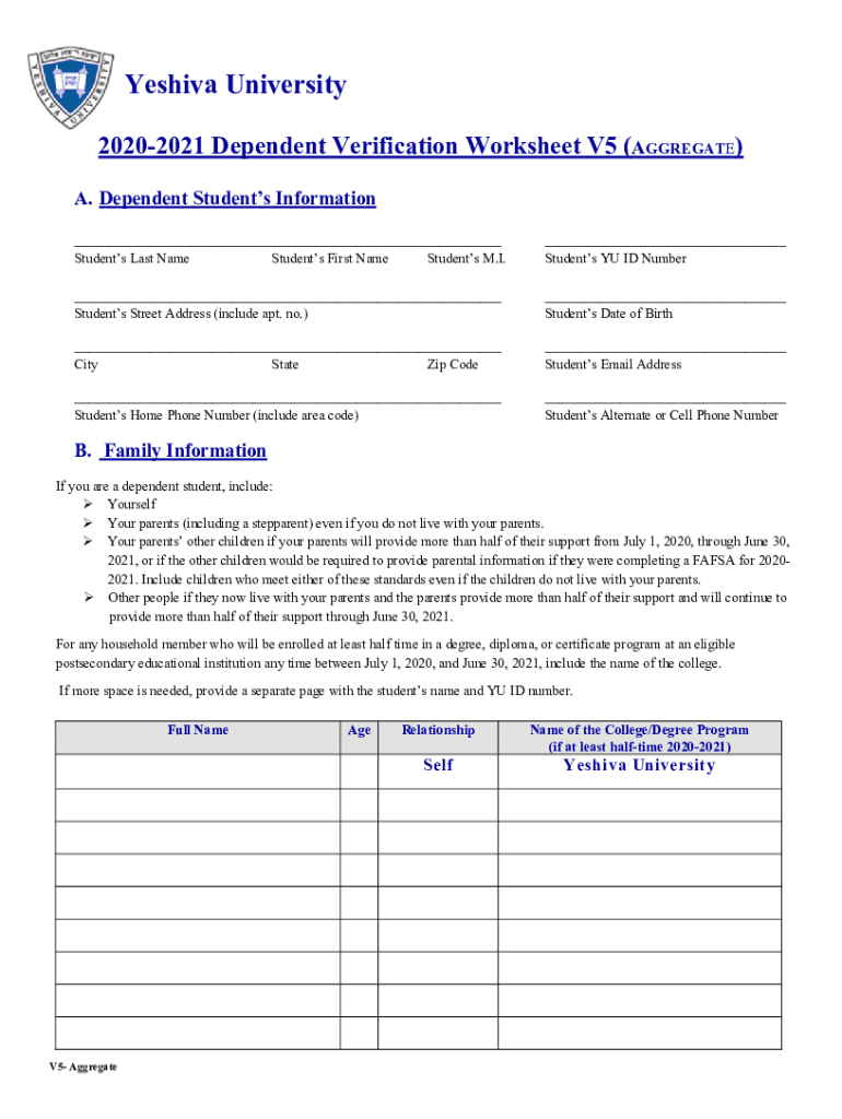 Print Forrest FormYeshiva University 20202021 Dependent Verification Worksheet V5 (AGGREGATE) A. Dependent Students Information ___ Students Last Name Students First Name Students M.I.___ Students