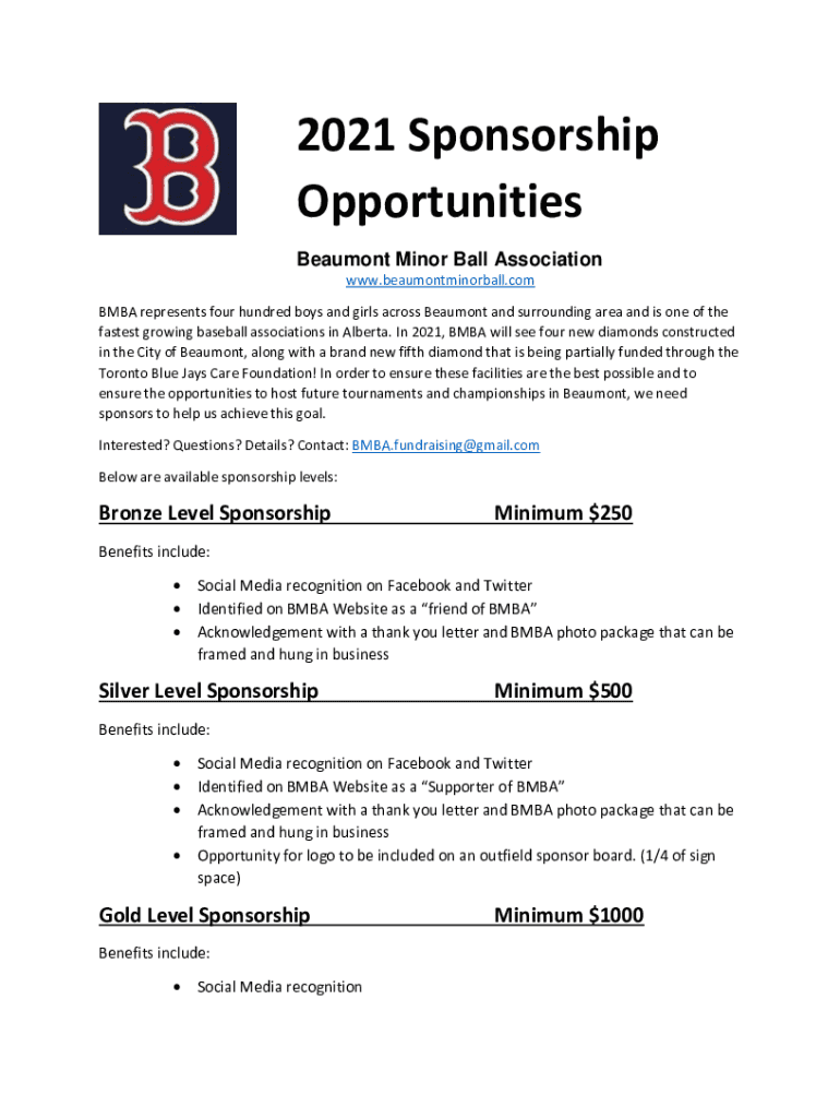 2021 Sponsorship Opportunities Beaumont Minor Ball Association www.beaumontminorball.com BMA represents four hundred boys and girls across Beaumont and surrounding area and is one of the fastest growing