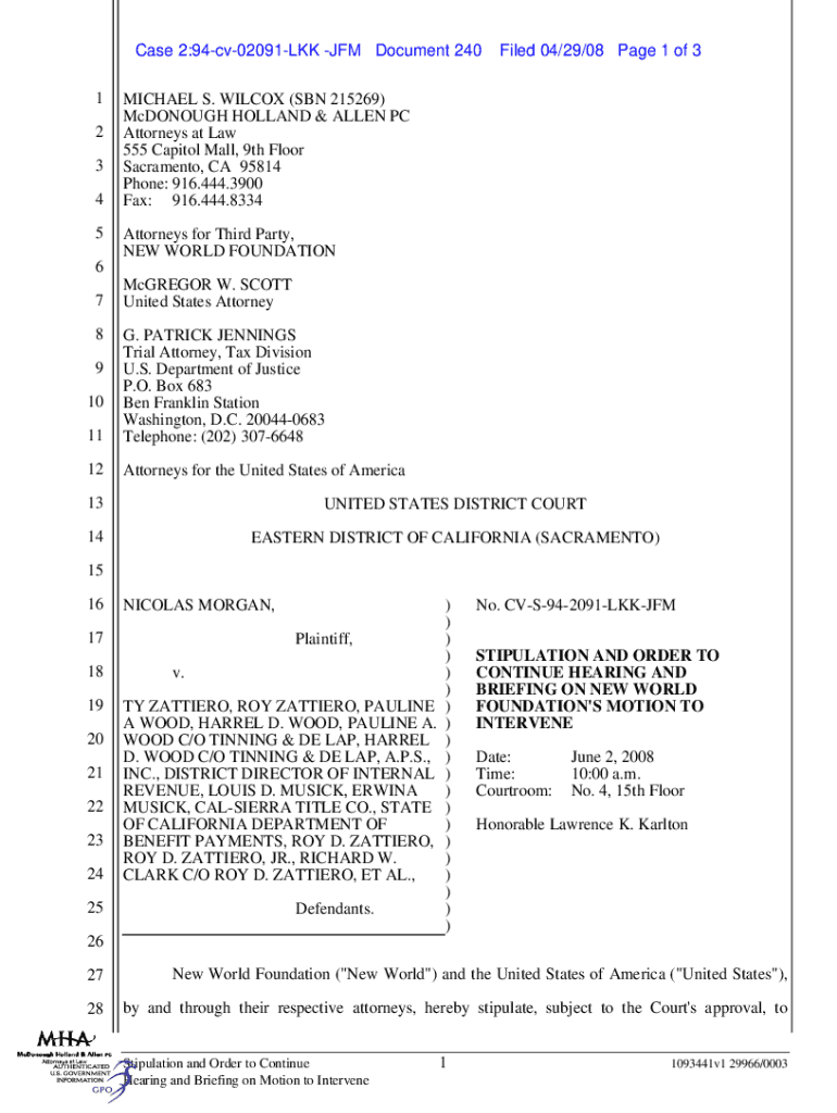Case 2:94cv02091LKK FM Document 240 1 2 3 4 5Filed 04/29/08-Page 1 of 3MICHAEL S. WILCOX (SON 215269) McDonough HOLLAND & ALLEN PC Attorneys at Law 555 Capitol Mall, 9th Floor Sacramento, CA 95814