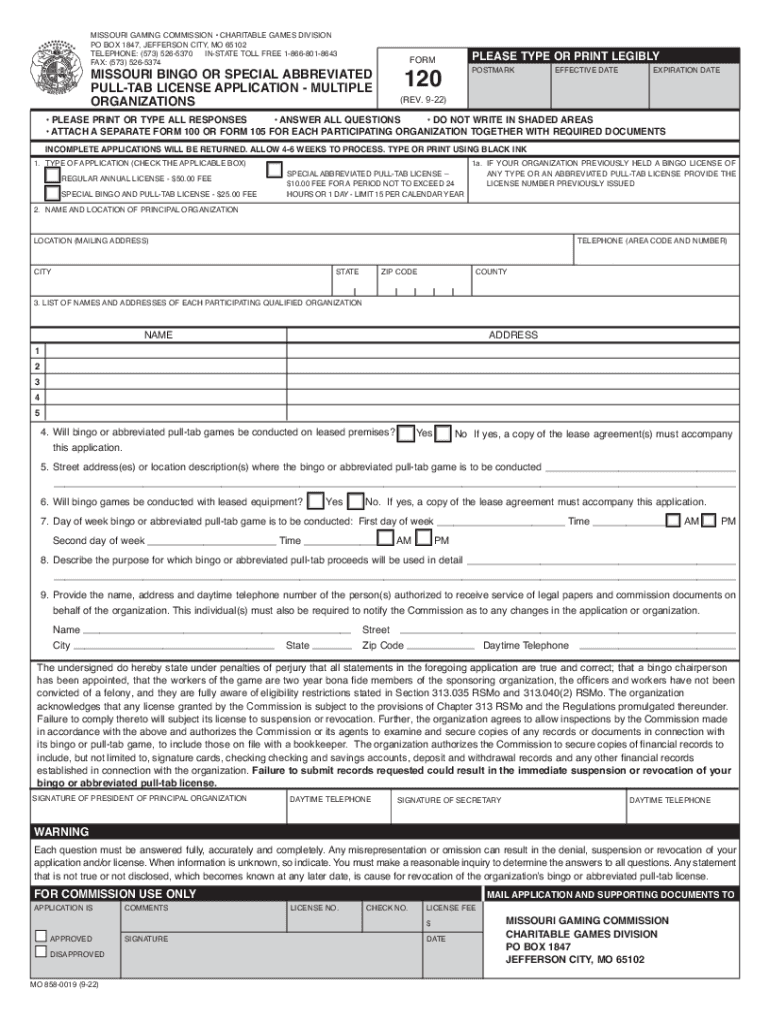 Print FormMISSOURI GAMING COMMISSION CHARITABLE GAMES DIVISION PO BOX 1847, JEFFERSON CITY, MO 65102 TELEPHONE: (573) 5265370 INSTATE TOLL FREE 18668018643 FAX: (573) 5265374PLEASE TYPE OR PRINT LEGIBLYFORMMISSOURI