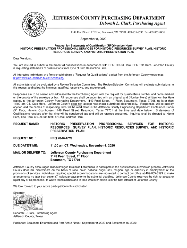 JEFFERSON COUNTY PURCHASING DEPARTMENT Deborah L. Clark, Purchasing Agent 1149 Pearl Street, 1st Floor, Beaumont, TX 77701 4098358593 Fax 4098358456September 8, 2020 Request for Statements of Qualification
