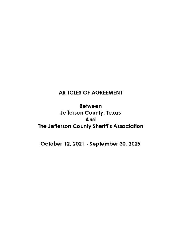 ARTICLES OF AGREEMENT Between Jefferson County, Texas And The Jefferson County Sheriffs Association October 12, 2021, September 30, 2025TABLE OF CONTENTS ARTICLE PROVISION PAGE Art No 1 2 3 4 5 6