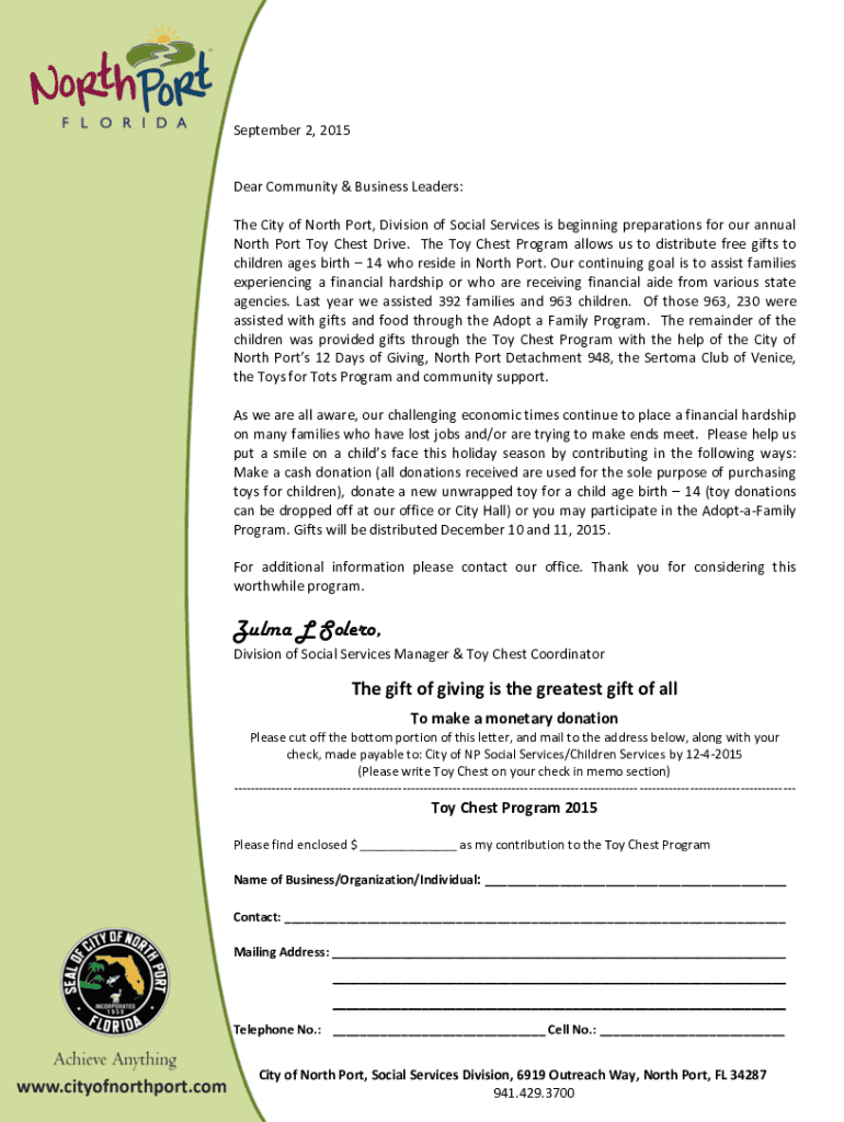 September 2, 2015Dear Community & Business Leaders: The City of North Port, Division of Social Services is beginning preparations for our annual North Port Toy Chest Drive. The Toy Chest Program allows