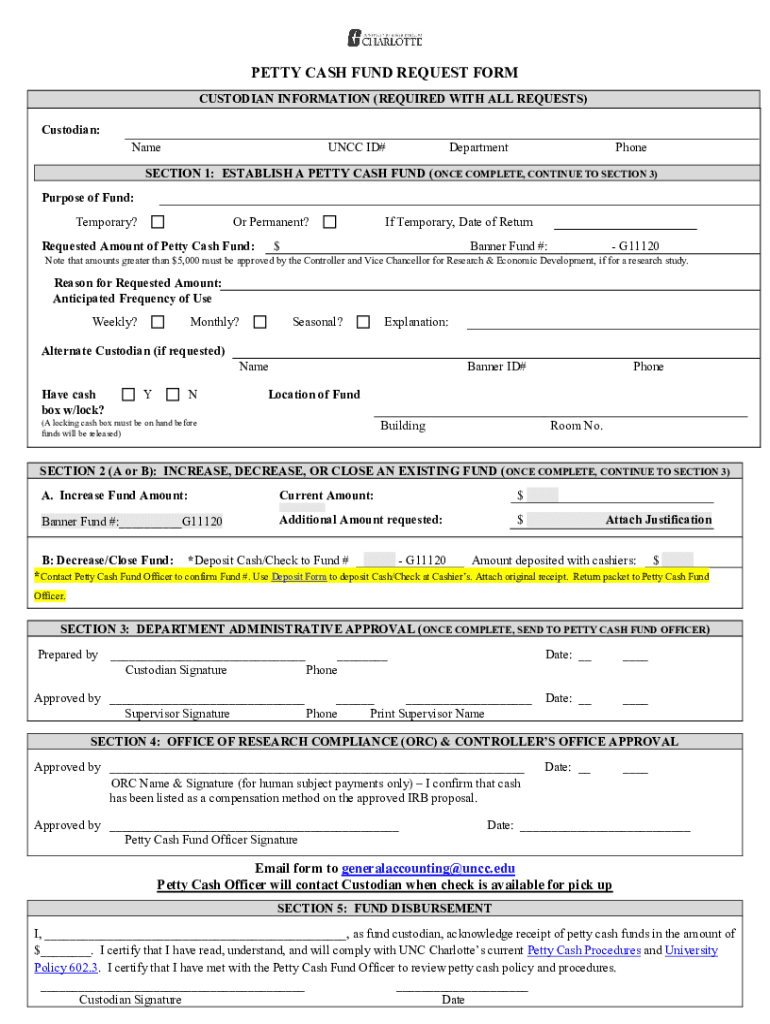 NameUNCC ID#DepartmentPhoneSECTION 1: ESTABLISH A PETTY CASH FUND (ONCE COMPLETE, CONTINUE TO SECTION 3)
