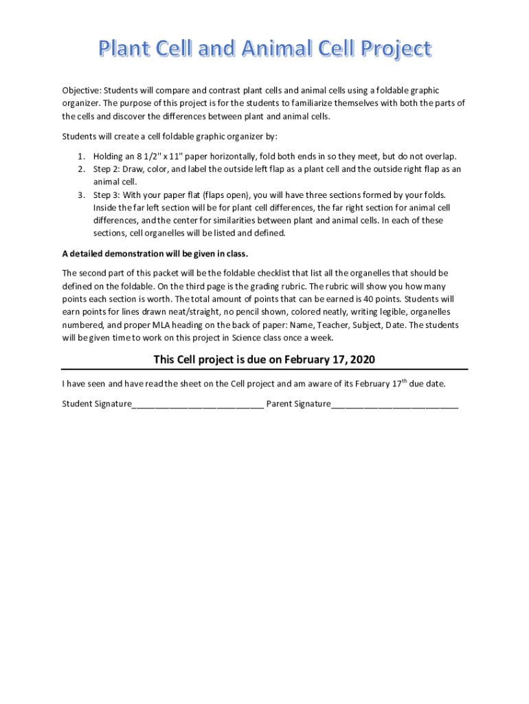 Objective: Students will compare and contrast plant cells and animal cells using a foldable graphic organizer. The purpose of this project is for the students to familiarize themselves with both the