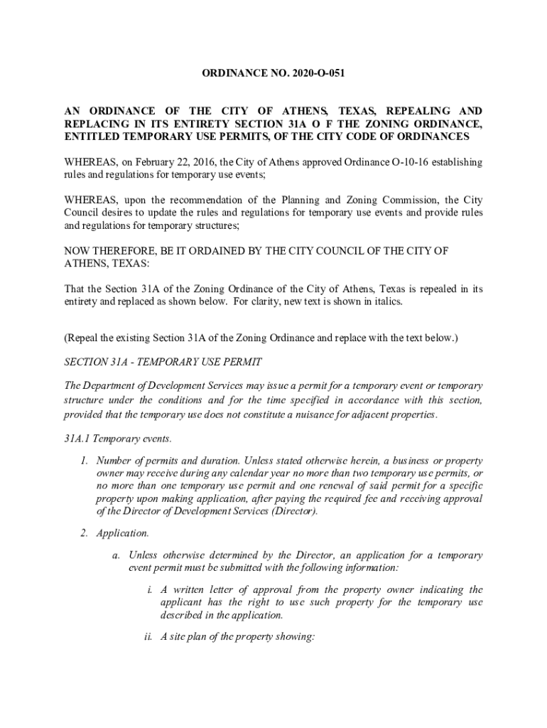 ORDINANCE NO. 2020O051 AN ORDINANCE OF THE CITY OF ATHENS, TEXAS, REPEALING AND REPLACING IN ITS ENTIRETY SECTION 31A O F THE ZONING ORDINANCE, ENTITLED TEMPORARY USE PERMITS, OF THE CITY CODE OF