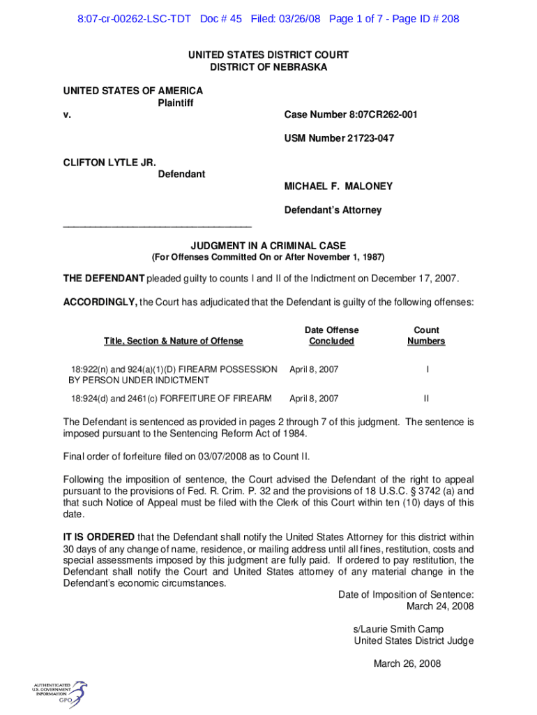 8:07cr00262LSCTDT Doc # 45 Filed: 03/26/08-Page 1 of 7-Page ID # 208 UNITED STATES DISTRICT COURT DISTRICT OF NEBRASKA UNITED STATES OF AMERICA Plaintiff v. Case Number 8:07CR262001 US Number 21723047CLIFTON