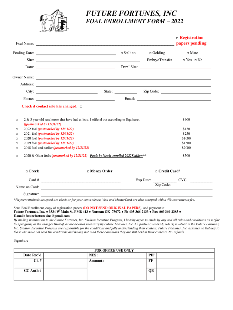 FUTURE FORTUNES, INC FOAL ENROLLMENT FORM 2022 Registration papers pendingFoal Name: StallionFoaling Date: Gelding Sire: Mare Yes NoEmbryoTransfer Dam Sire:Dam: Owner Name: Address: City:State:Phone: