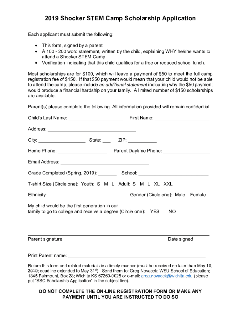 2019 Shocker STEM Camp Scholarship Application Each applicant must submit the following: This form, signed by a parent A 100 200 word statement, written by the child, explaining WHY he/she wants to