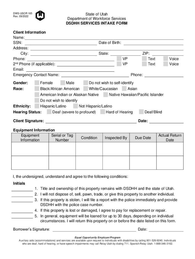 DISUSED 165 Rev. 09/2022State of Utah Department of Workforce Services DS DHH SERVICES INTAKE Formulaic Information Name: SSN: Address: City: Phone: 2nd Phone (if applicable): Email: Emergency Contact