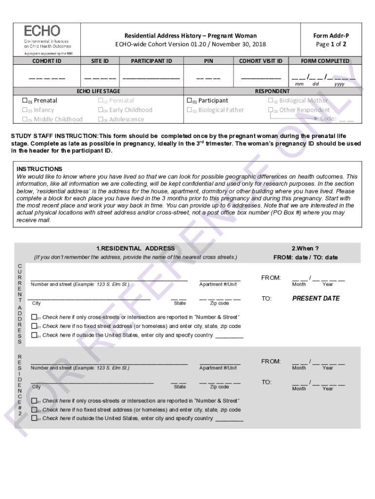 Residential Address History Pregnant Woman ECHO wide Cohort Version 01.20 / November 30, 2018Form Added Page 1 of 2COHORT IDS ITE PARTICIPANT IDPINCOHORT VISIT INFORM COMPLETED__ __ __ __ ____ __