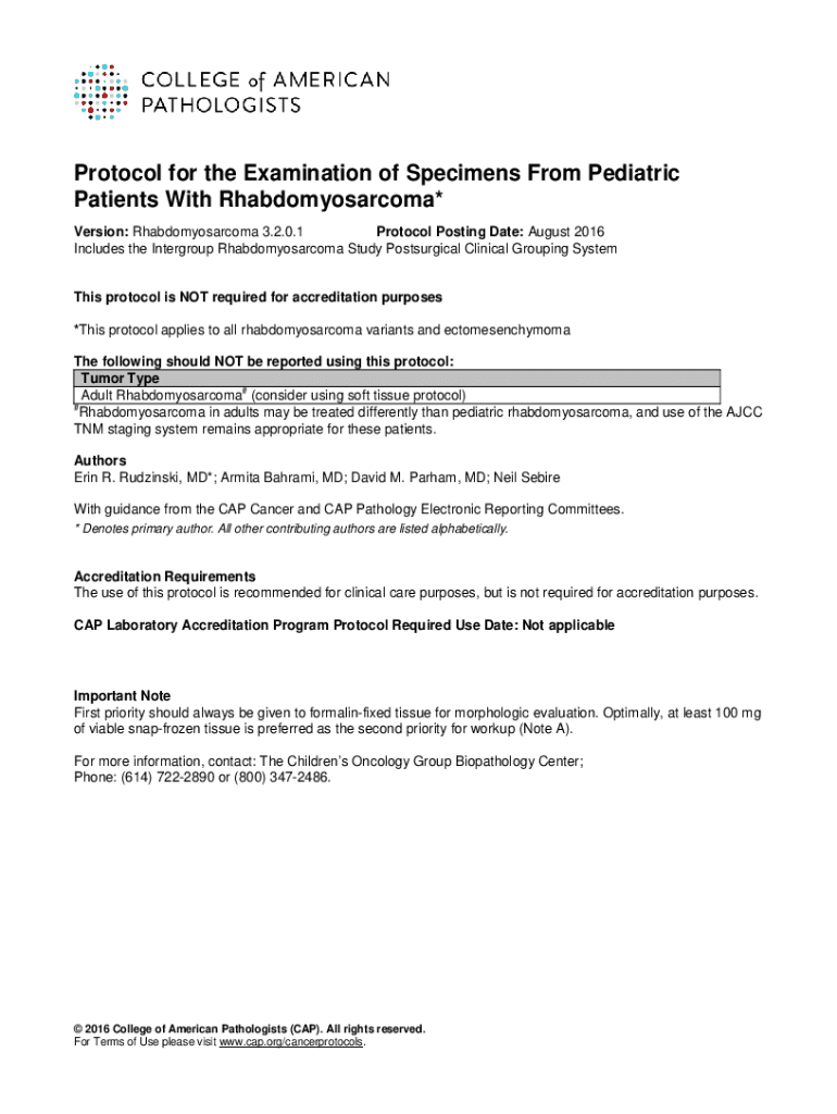 Protocol for the Examination of Specimens From Pediatric Patients With Rhabdomyosarcoma* Version: Rhabdomyosarcoma 3.2.0.1 Protocol Posting Date: August 2016 Includes the Intergroup Rhabdomyosarcoma