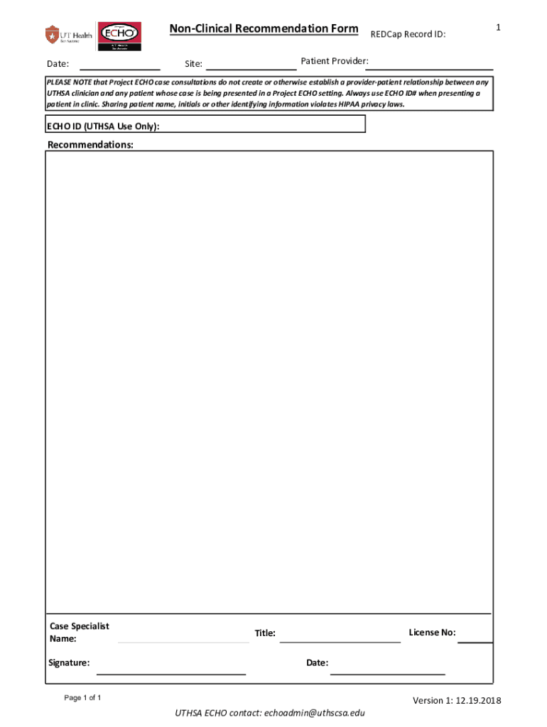 Nonclinical Recommendation Form Date:Redcap Record ID:1Patient Provider:Site:PLEASE NOTE that Project ECHO case consultations do not create or otherwise establish a provider patient relationship between