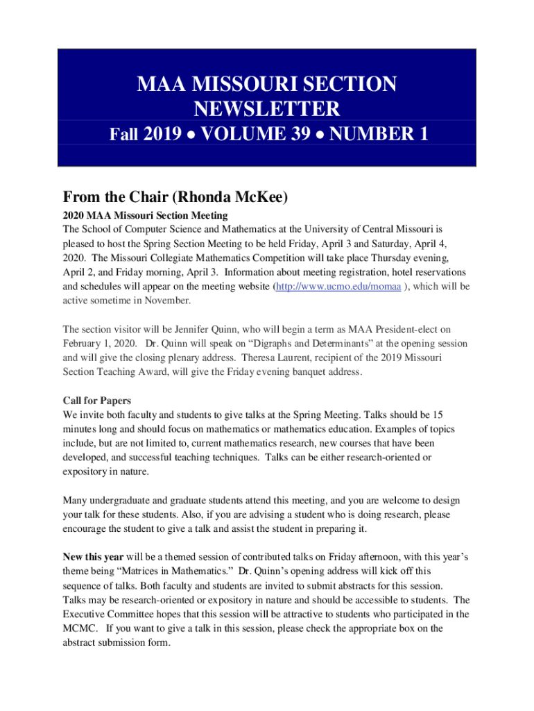 MAY MISSOURI SECTION NEWSLETTER Fall 2019 VOLUME 39 NUMBER 1From the Chair (Rhonda McKee) 2020 MAY Missouri Section Meeting The School of Computer Science and Mathematics at the University of Central