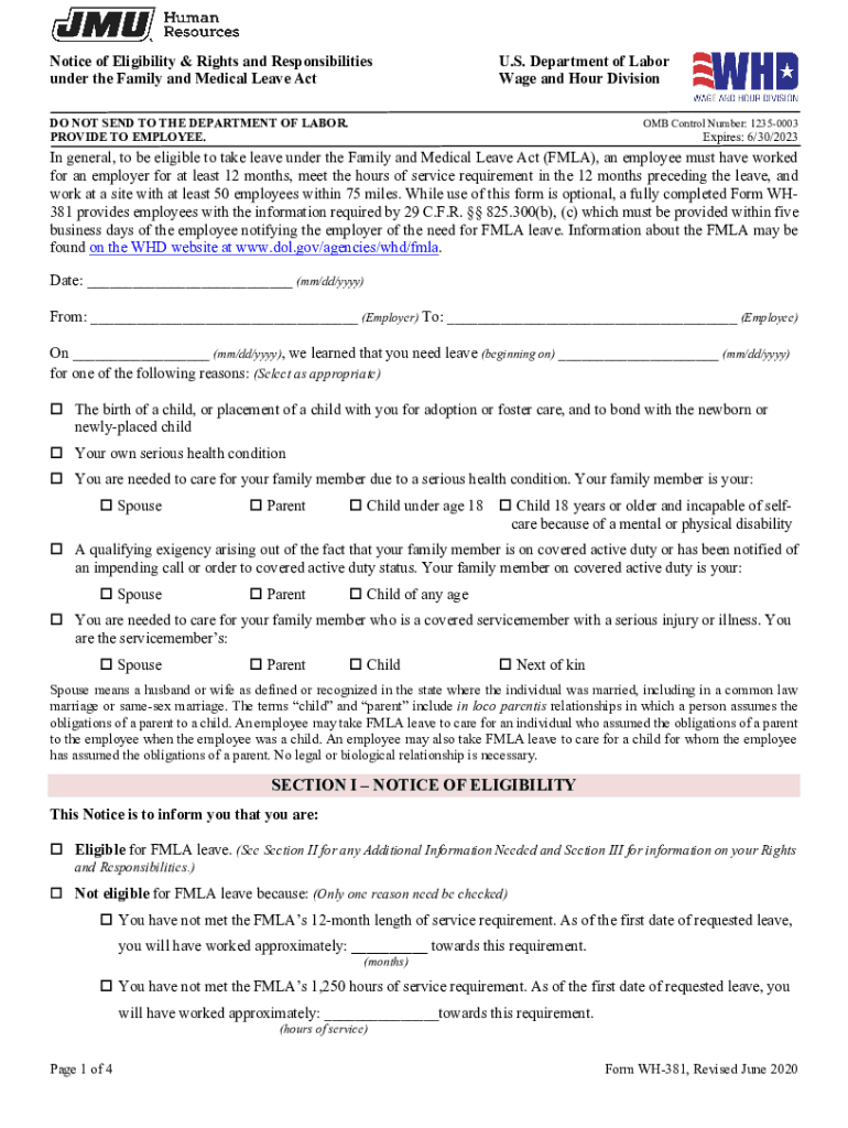 Notice of Eligibility & Rights and Responsibilities under the Family and Medical Leave Act. S. Department of Labor Wage and Hour Division DO NOT SEND TO THE DEPARTMENT OF LABOR. PROVIDE TO EMPLOYEE.OMB