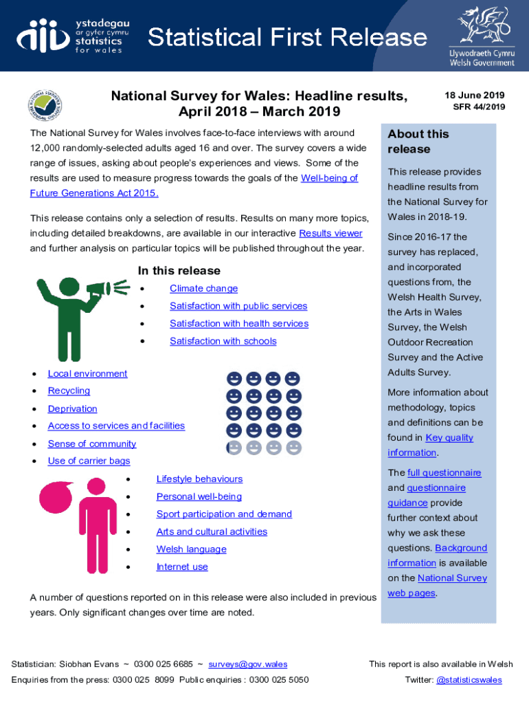 National Survey for Wales: Headline results, April 2018 March 201918 June 2019 SFR 44/2019About this released National Survey for Wales involves facetoface interviews with around 12,000 randomly selected