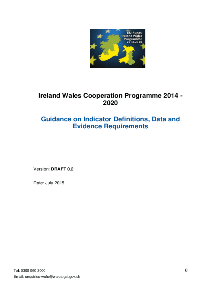 Ireland Wales Cooperation Program 2014 2020 Guidance on Indicator Definitions, Data and Evidence RequirementsVersion: DRAFT 0.2 Date: July 2015Tel: 0300 060 3000 Email: enquirieswefo@wales.gsi.gov.uk0Contents