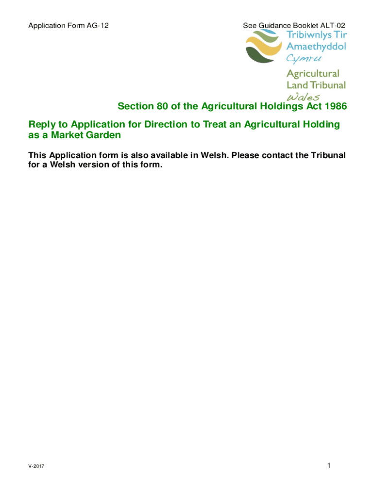 Application Form AG12See Guidance Booklet ALT02Section 80 of the Agricultural Holdings Act 1986 Reply to Application for Direction to Treat an Agricultural Holding as a Market Garden This Application