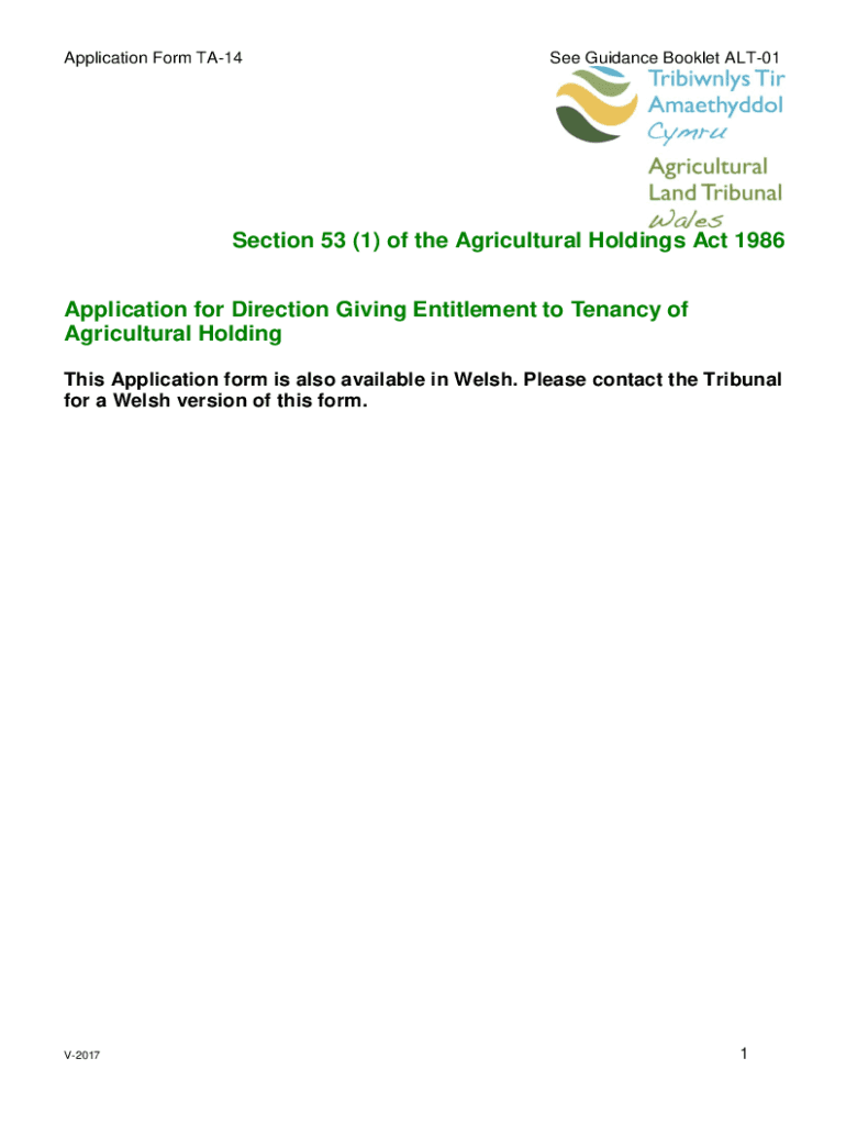 Application Form TA14See Guidance Booklet ALT01Section 53 (1) of the Agricultural Holdings Act 1986