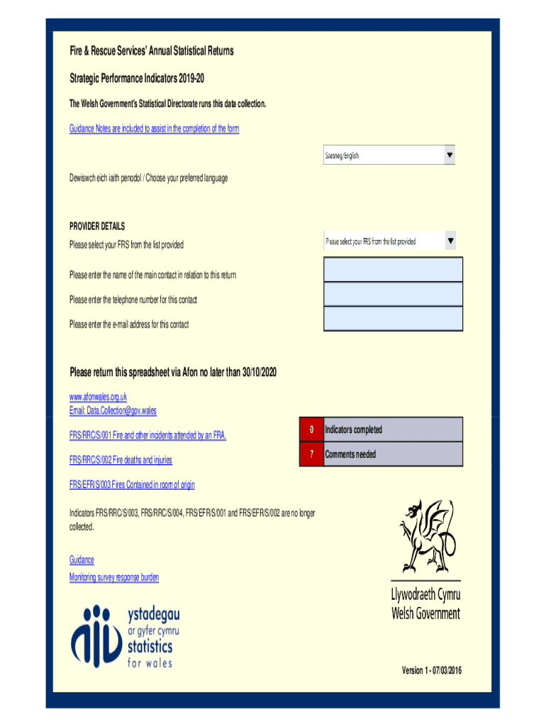 Fire & Rescue Services\' Annual Statistical Returns Strategic Performance Indicators 201920 The Welsh Government\'s Statistical Directorate runs this data collection. Guidance Notes are included to