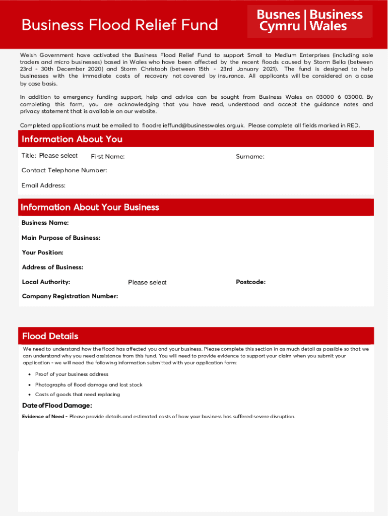 Business Flood Relief Fund Welsh Government have activated the Business Flood Relief Fund to support Small to Medium Enterprises (including sole traders and micro businesses) based in Wales who have