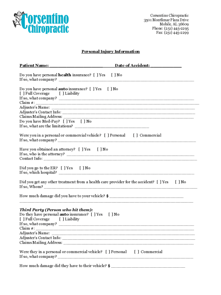 Consenting Chiropractic 3501 Mortimer Plaza Drive Mobile, AL 36609 Phone: (251) 4452295 Fax: (251) 4452299Personal Injury Information Patient Name: ___Date of Accident: ___Do you have personal health