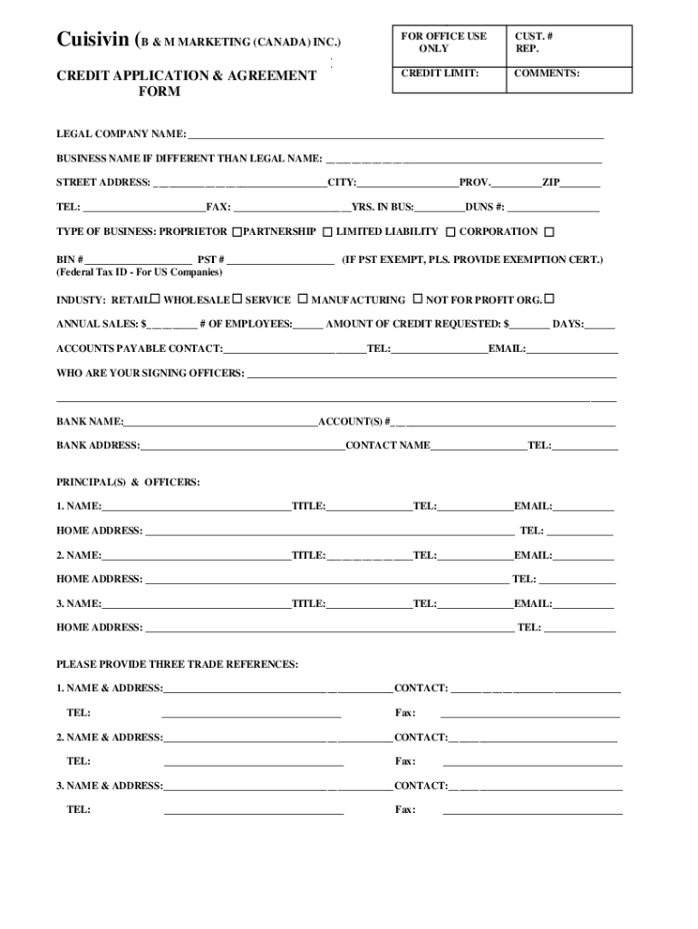 Cuisine (B & M MARKETING (CANADA) INC.)FOR OFFICE USE LOCUST. # REP.CREDIT APPLICATION & AGREEMENT NONCREDIT LIMIT:COMMENTS:LEGAL COMPANY NAME: ___ BUSINESS NAME IF DIFFERENT From LEGAL NAME: ___