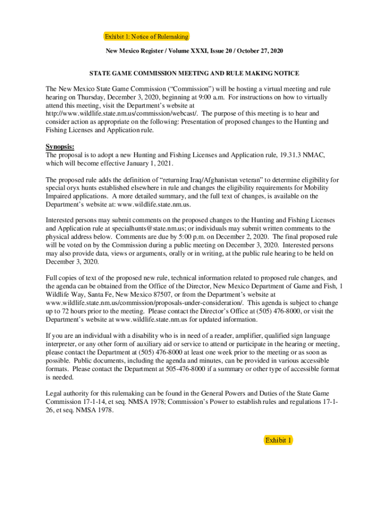 Exhibit 1: Notice of Rule making New Mexico Register / Volume XXXI, Issue 20 / October 27, 2020STATE GAME COMMISSION MEETING AND RULE MAKING Notice New Mexico State Game Commission (Commission) will