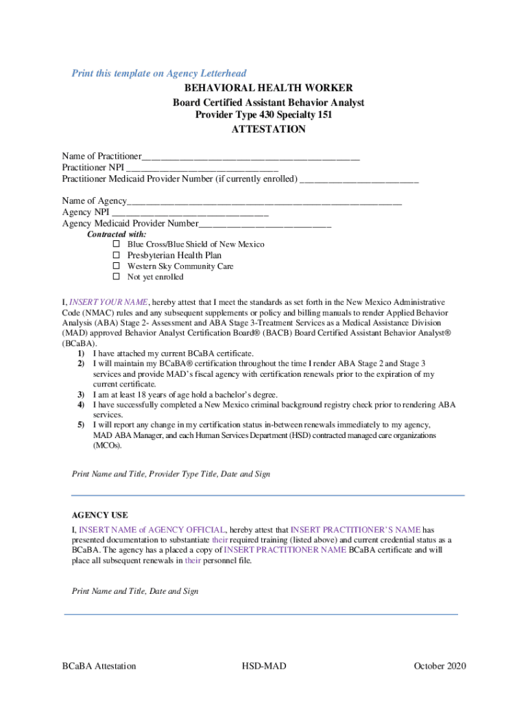 Print this template on Agency Letterhead BEHAVIORAL HEALTH WORKER Board Certified Assistant Behavior Analyst Provider Type 430 Specialty 151 ATTESTATION Name of Practitioner___ Practitioner NPI ___