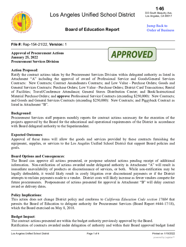 146Los Angeles Unified School District Board of Education Report333 South Beau dry Ave, Los Angeles, CA 90017Jump Back to Order of Businesslike #: Rep15421/22, Version: 1 Approval of Procurement Actions