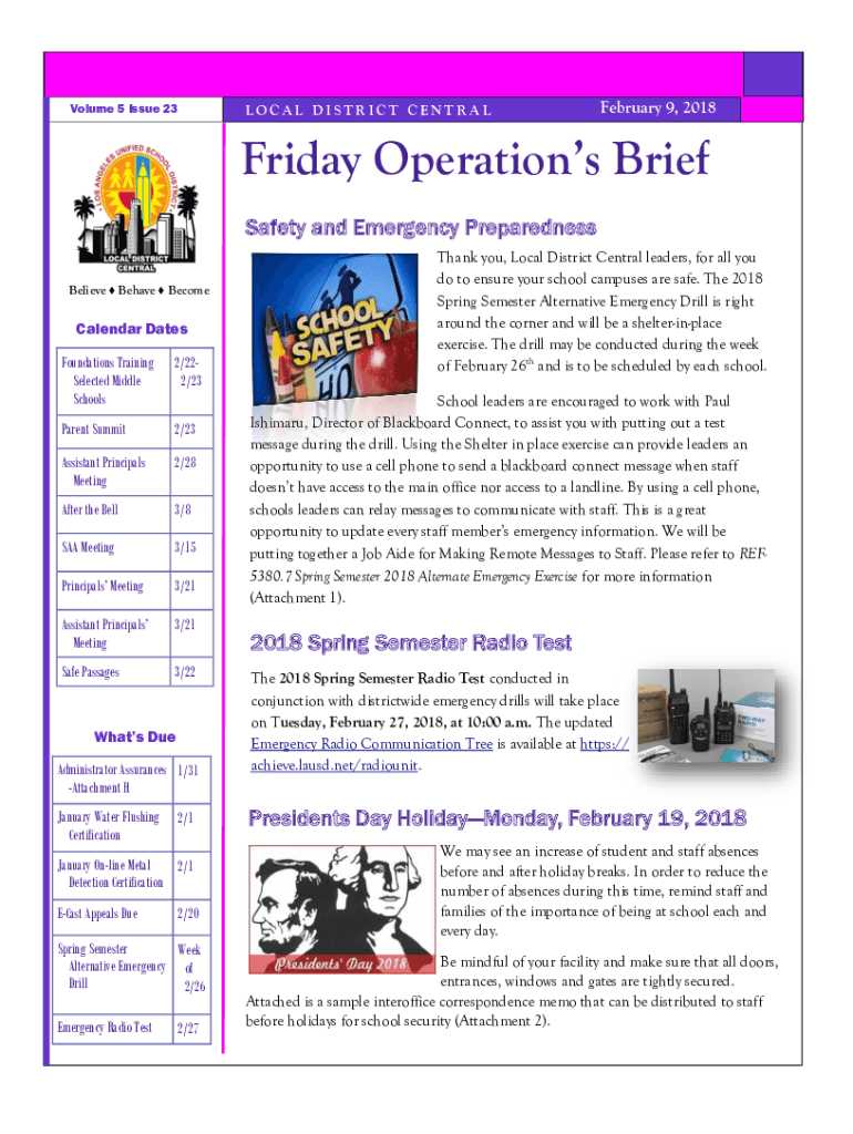 Volume 5 Issue 23LOCAL DISTRICT CENTRAL February 9, 2018Friday Operations Brief Safety and Emergency Preparedness Believe Behave BecomeCalendar Dates Foundations Training Selected Middle Schools2/222/23Parent