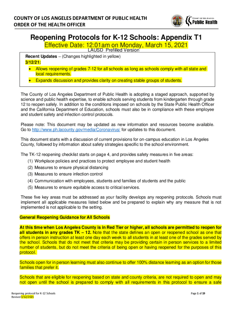 COUNTY OF LOS ANGELES DEPARTMENT OF PUBLIC HEALTH ORDER OF THE HEALTH OFFICERReopening Protocols for K12 Schools: Appendix T1 Effective Date: 12:01am on Monday, March 15, 2021, LAUD Prefilled VersionRecent