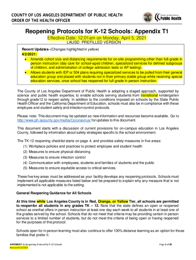 COUNTY OF LOS ANGELES DEPARTMENT OF PUBLIC HEALTH ORDER OF THE HEALTH OFFICERReopening Protocols for K12 Schools: Appendix T1 Effective Date: 12:01am on Monday, April 5, 2021, LAUD PREFILLED VERSION