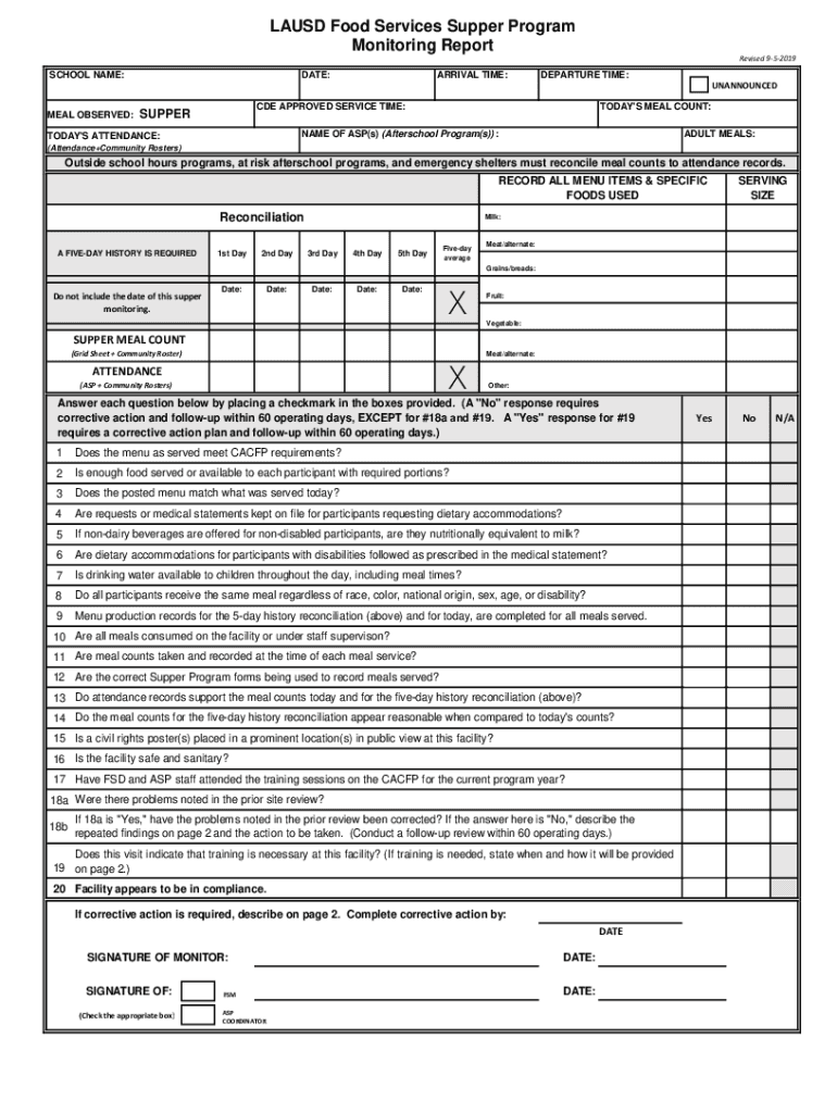 LAUD Food Services Supper Program Monitoring Report DATE:SCHOOL NAME:MEAL OBSERVED:ARRIVAL TIME:UNANNOUNCED CDE APPROVED SERVICE TIME:Supervised 952019DEPARTURE TIME: TODAY\'S MEAL COUNT:NAME OF ASP(s)