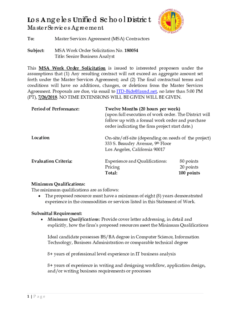 Los Angeles Unified School District Master Services Agreement To:Master Services Agreement (MSA) ContractorsSubject:MSA Work Order Solicitation No. 180054 Title: Senior Business Analysis MSA Work
