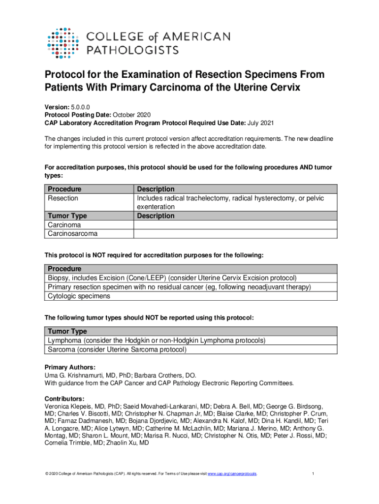 Protocol for the Examination of Resection Specimens From Patients With Primary Carcinoma of the Uterine Cervix Version: 5.0.0.0 Protocol Posting Date: October 2020 CAP Laboratory Accreditation Program