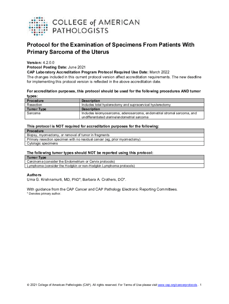 Protocol for the Examination of Specimens From Patients With Primary Sarcoma of the Uterus Version: 4.2.0.0 Protocol Posting Date: June 2021 CAP Laboratory Accreditation Program Protocol Required