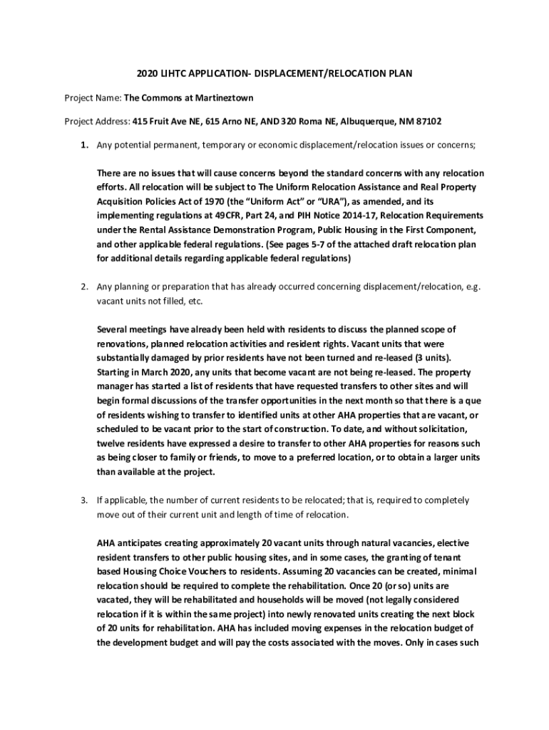 2020 LIH TC APPLICATION DISPLACEMENT/RELOCATION PLAN Project Name: The Commons at Martinez town Project Address: 415 Fruit Ave NE, 615 Arno NE, AND 320 Roma NE, Albuquerque, NM 87102 1. Any potential