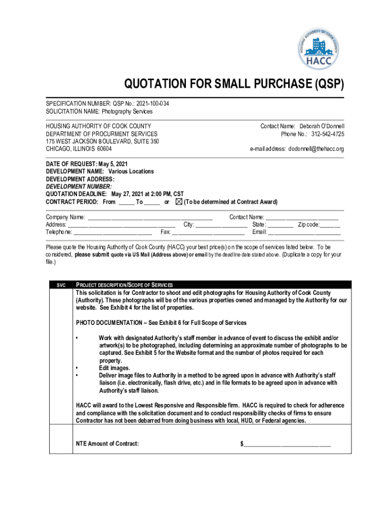 QUOTATION FOR SMALL PURCHASE (DSP) SPECIFICATION NUMBER: DSP No.: 2021100034 SOLICITATION NAME: Photography Services HOUSING AUTHORITY OF COOK COUNTY DEPARTMENT OF PROCUREMENT SERVICES 175 WEST JACKSON