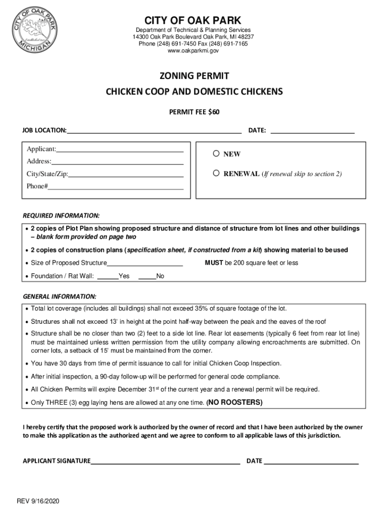 CITY OF OAK PARK Department of Technical & Planning Services 14300 Oak Park Boulevard Oak Park, MI 48237 Phone (248) 6917450 Fax (248) 6917165 www.oakparkmi.govZONING PERMIT CHICKEN COOP AND DOMESTIC