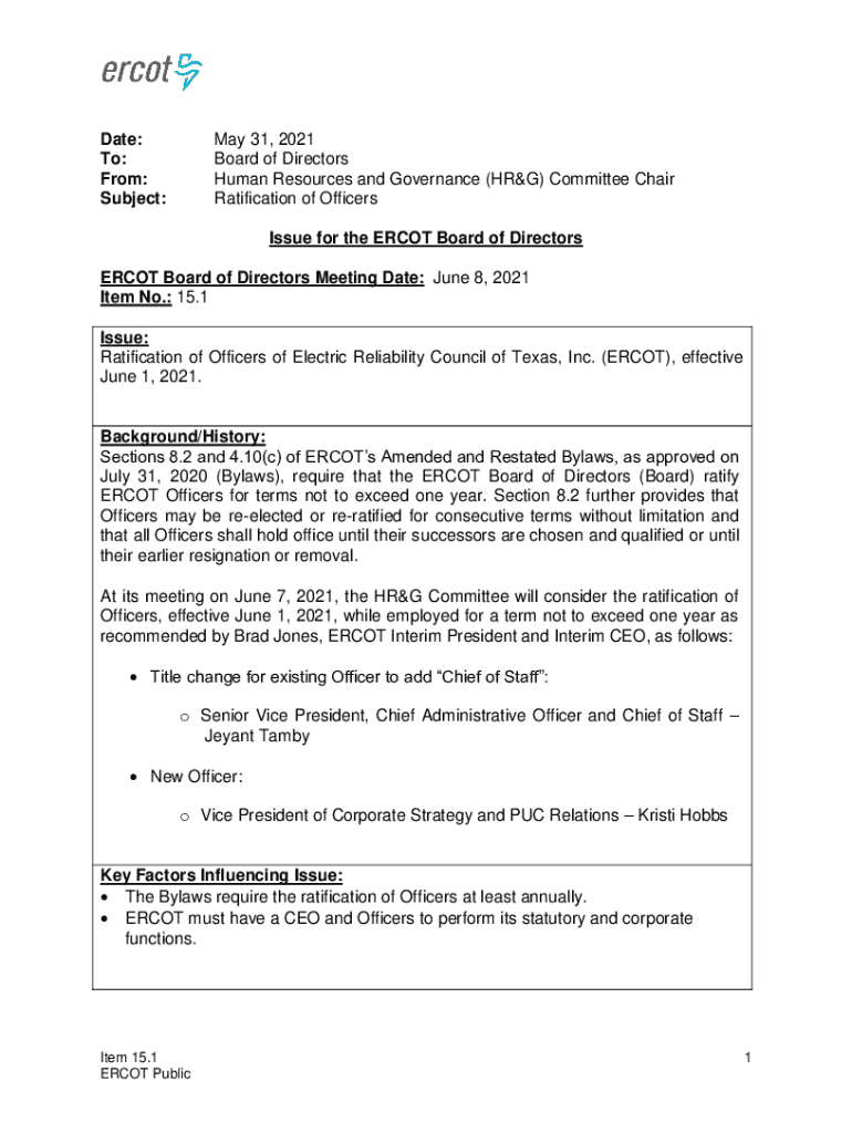 Date: To: From: Subject:May 31, 2021, Board of Directors Human Resources and Governance (DRUG) Committee Chair Ratification of Officers Issue for the EPCOT Board of DirectorsERCOT Board of Directors