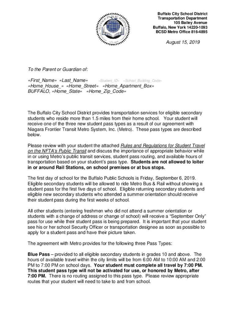 Buffalo City School District Transportation Department 105 Bailey Avenue Buffalo, New York 142201093 BSD Metro Office 8164895August 15, 2019To the Parent or Guardian of: First_Name Last_Name Student_ID