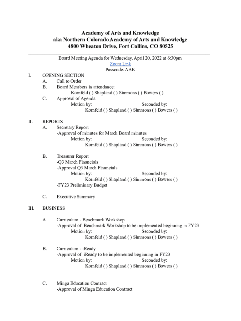 Academy of Arts and Knowledge aka Northern Colorado Academy of Arts and Knowledge 4800 Wheaton Drive, Fort Collins, CO 80525 ___ Board Meeting Agenda for Wednesday, April 20, 2022, at 6:30pm Zoom