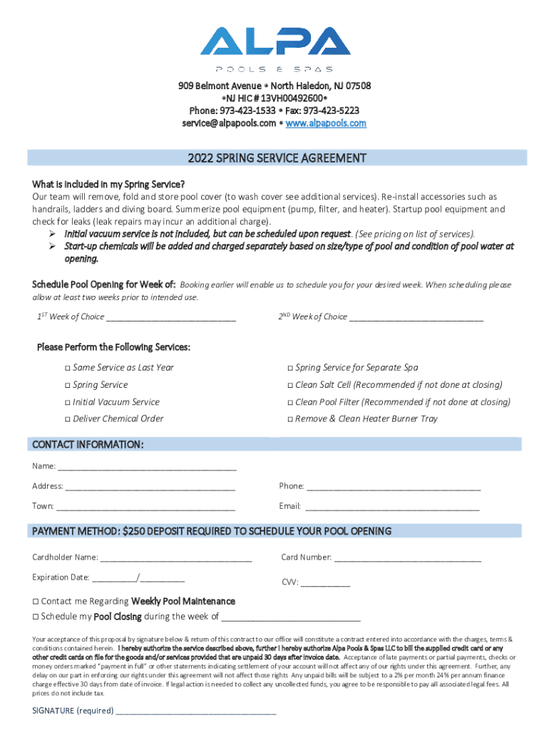 909 Belmont Avenue North Hale don, NJ 07508 NJ HIC # 13VH00492600 Phone: 9734231533 Fax: 9734235223 service@alpapools.com www.alpapools.com2022 SPRING SERVICE AGREEMENT What is included in my Spring