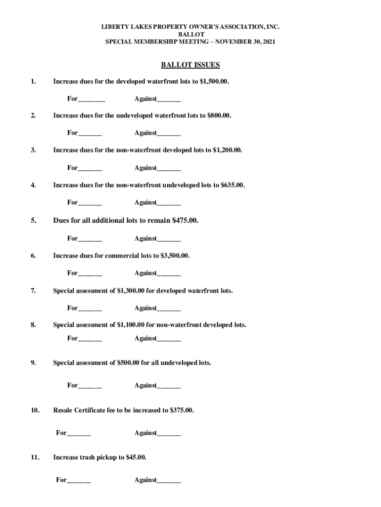 LIBERTY LAKES PROPERTY OWNER\'S ASSOCIATION, INC. BALLOT SPECIAL MEMBERSHIP MEETING NOVEMBER 30, 2021BALLOT ISSUES 1. Increase dues for the developed waterfront lots to $1,500.00. For___2. Increase